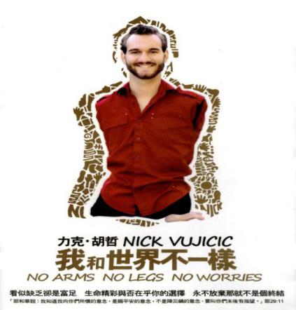 当面对身体残缺的残疾人,你第一感触不知是否是同情,抑或是暗自庆幸......但,有那么一个人,他的经历却足以让许多四肢健全的的人为之汗颜,甚至是仰望――他就是被称为“无肢英雄”的青年励志家力克.胡哲,曾激励感动无数人的那个铮铮铁汉。上天给他的的出生开了巨大的玩笑,他却以不屈来回应,他相信自己的躯体不能束缚住自己的能量,他要为为自己描绘最美的人生蓝图。于是他尝试着,努力着,将一个个成就收入囊中.......