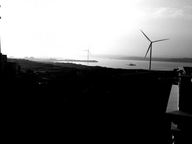 落日的余晖依旧掩盖不住梯田焕发的生机,在自家庭院里摘菜下厨,为归家的游子准备一餐热腾腾的饭。海风轻轻拂过脸颊,吹动“大风车”转呐转呐,不知道又为几家带去了光明。渐行渐远的渔船要开往何处,又何时归来,而我只想向船上的渔夫轻轻挥手,希望他向大海带去陆地的问候。冬日乡村的傍晚在此刻静谧又美好,所有的颜色都已沉静,而黑夜尚未来临,想起三毛说过:“岁月极美,在于它必然流逝。”故而想用黑白滤镜抓住这一刻,没有色彩,任凭所有人在画面上天马行空。