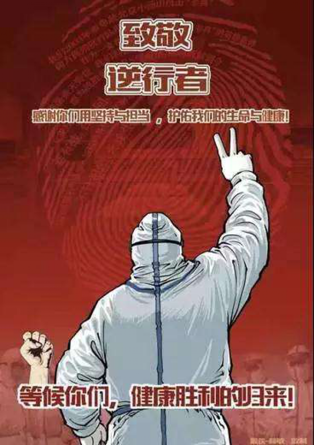 本是新春佳节,张灯结彩之际,街道上却空无一人,清冷萧瑟;本应该是国泰安民,海晏河清之时,冠状病毒瘟疫却笼罩在华夏大地,猖狂肆虐;本应是磕家团圆,尽享欢乐之际,无数平凡英雄却告别亲人,背起行囊,共赴国难……我不知道你的名字,但我却记得你的样子;我不知道你是谁,但我知道你是为了春回大雁归。笨重的防护服,裹在你窈窕的身躯上,看不到你的容颜,却能感受到你炽热的关怀,听到你安抚的声音。身着白衣逆行,只与死神抗争。你们是最美的逆行者,也是这个时代最可爱的人。