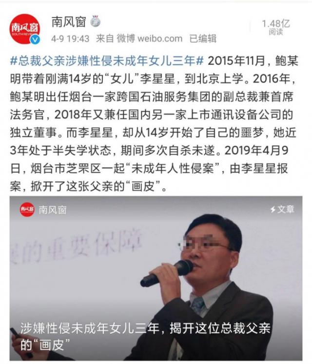 2020年4月9日,《南风窗》微博官方号曝光了总裁父亲鲍毓明光鲜外表之下的真实面目——性侵养女李星星长达三年半的时间。据报道称,从2016年初鲍毓明就开始对养女李星星进行性侵害,在此期间李星星处于半失学状态,曾多次自杀未遂。这一起“未成年人性侵案”在网上掀起了轩然大波,网民们在声讨鲍毓明的同时也关注着在重度抑郁症和PSTD煎熬下的治疗动向。
