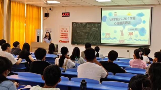 为加强新生心理健康教育工作队伍建设,提升心理委员的专业素养与实际工作能力,2025年10月9日,虚拟现实(VR)现代产业学院于青云楼S205召开2025级新生心理委员工作会议暨心理普查培训会,此次会议由学院心理辅导员雷婧老师主讲。